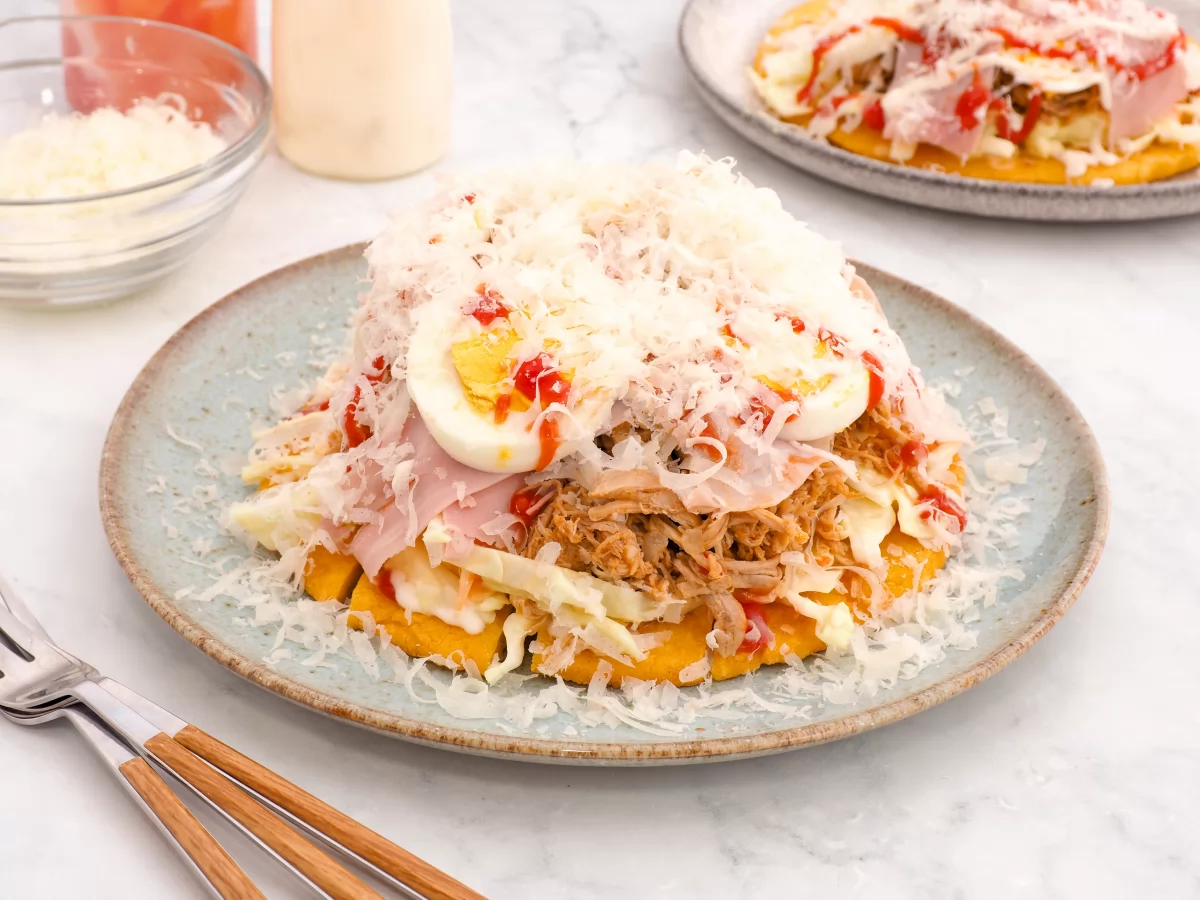 Para montar las arepas cabimeras colocamos la arepa frita en la base del plato cortada en cuadraditos de bocado y después, vamos poniendo por encima el resto de ingredientes: mayonesa, kétchup, ensalada de col, carne mechada, jamón cocido, huevo cocido y una cantidad generosa de queso rallado.