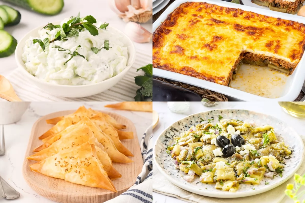 Con solo echar un vistazo a su recetario, se puede vislumbrar cuáles son los pilares de la dieta griega: ingredientes frescos —tomate, pepino, calabacín, berenjena...—, aceite de oliva, hierbas aromáticas y queso feta. De este modo, nos encontramos con platos con las verduras como protagonistas, como es el caso de la famosa musaka, las kolokithokeftedes (croquetas de calabacín) o el spanakorizo (arroz de espinacas); en cuanto al queso feta, cobra importancia en multitud de preparaciones, entre las que se cuentan el tirokafteri, el saganaki o la tiropita. También cabe sacar a relucir la presencia del yogur griego en las elaboraciones de Grecia; además de ser increíble por sí mismo, es esencial en platos como el tzatziki.