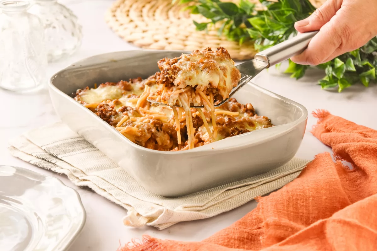 Aunque esta es una receta a la que cada persona le da su toque personal, básicamente consiste en hacer capas de espaguetis combinadas con capas de queso, una capa superior de carne picada en salsa cubierta con otra capa de mozzarella y queso parmesano. El conjunto se hornea hasta que quede con un bonito tono gratinado superior y sobra decir lo rico que queda.