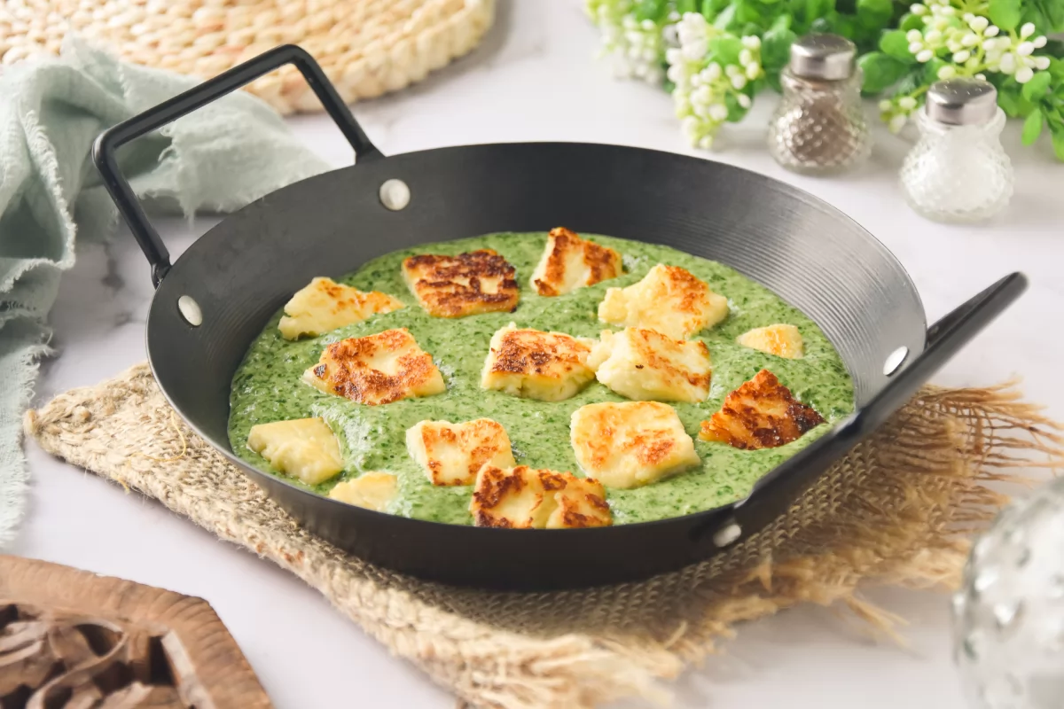 Servimos el palak paneer colocando como base el triturado de espinacas y encima el paneer a la plancha reservado.