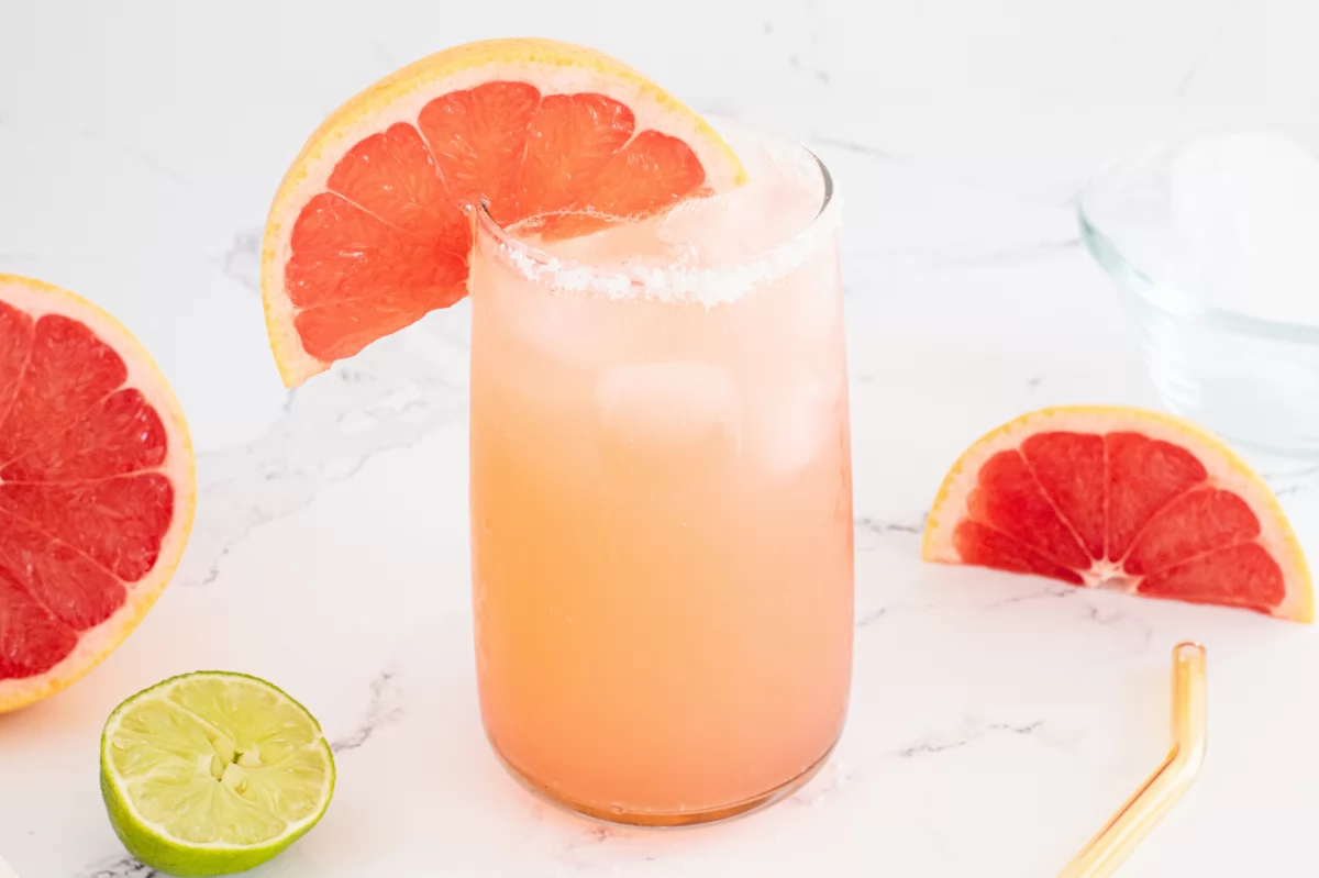 Terminamos el cóctel paloma decorando el vaso con una rodaja de pomelo.