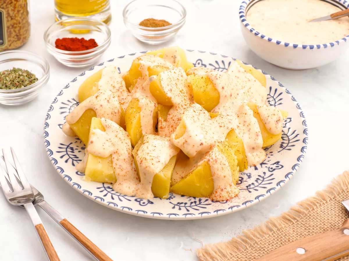 Colocamos las patatas en la base de un plato y las bañamos al gusto con la salsa mozárabe. A continuación, servimos las patatas mozárabes espolvoreadas por encima con una pizca de pimentón picante.