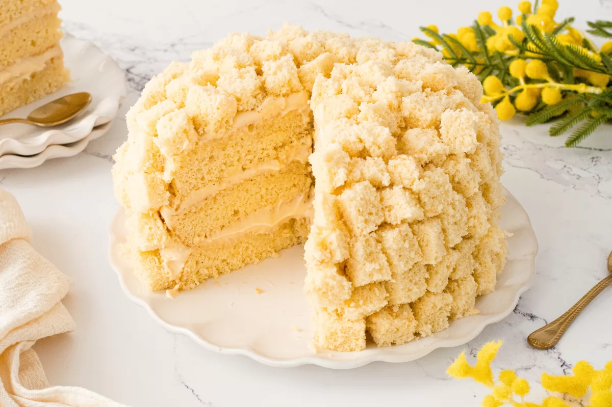 La tarta mimosa o torta mimosa, como también es conocida, es un dulce de origen italiano que suele prepararse el Día Internacional de la Mujer que se celebra el 8 de marzo, cuando se regalan flores de mimosa como símbolo de respeto y celebración. La decoración de esta vistosa tarta recuerda precisamente a estos esponjosos ramilletes amarillos con flores de mimosa, de ahí su nombre. Esta es una tarta dulce que nada tiene que ver con la tarta salada muchas veces conocida con este mismo nombre o ensalada mimosa.