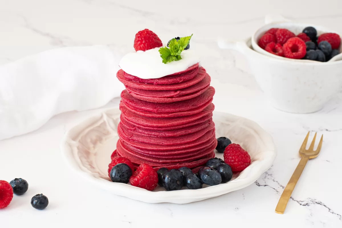 Una vez cocinadas las tortitas de remolacha, las vamos apilando en un plato y cuando las tengamos todas listas, las servimos con nuestros toppings favoritos.